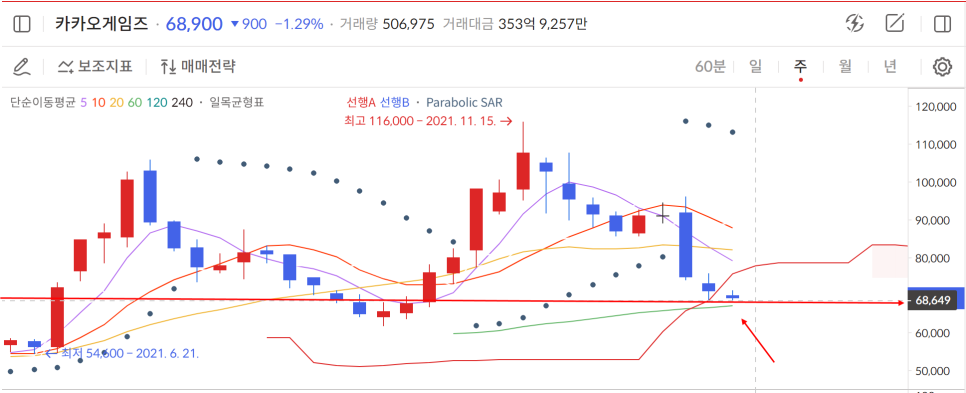 카카오게임즈는 현재 68900원으로 2차 지지선에 닿아 있는데