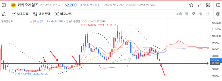 6만원이 깨질 때 작년의 위치를 생각해서 한 번 들어갈 수 있을 것으로 보이지만