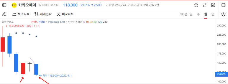 카카오페이는 이미 2월의 저점보다 더 아래인 115000원을 기록했고