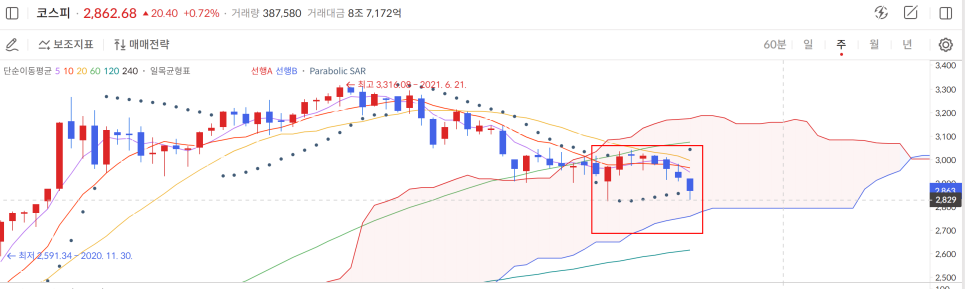 이평선이 크로스해서 단기 2872고점은 유지하면 좋을 거 같고