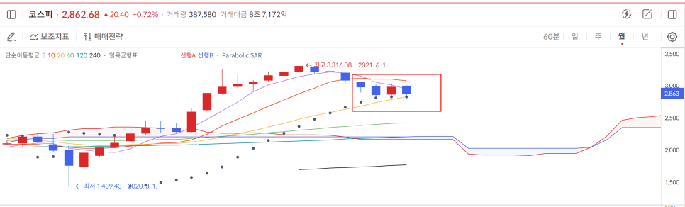 코스피가 3개월 연속 월봉 20일 노란선을 지키고 있습니다.