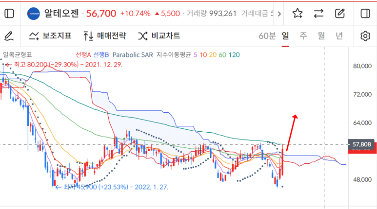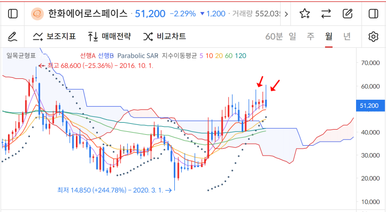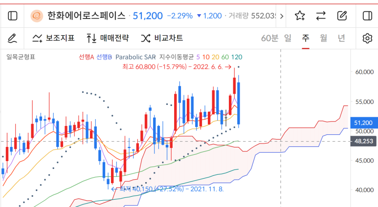 또한 월봉으로 볼 때 음봉사이의 2개의 양봉은 누리호라는 재료가 반영된 것일 듯 하다.