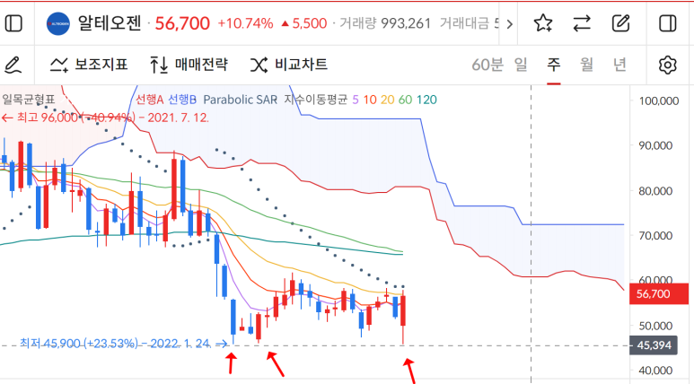주봉으로 차트가 꺠진지 오래인데다가 주봉상 음봉으로 계속해서 떨어지고 있으니.
