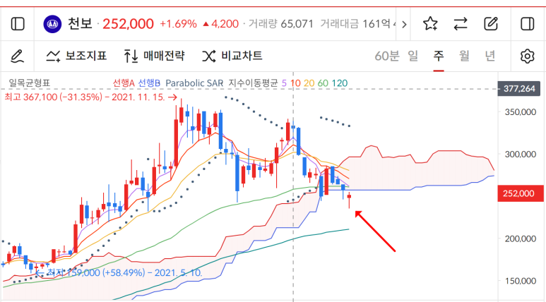 천보는 저점을 낮춘 상태에서 반등이 왔으므로, 추가하락의 가능성이 크지만