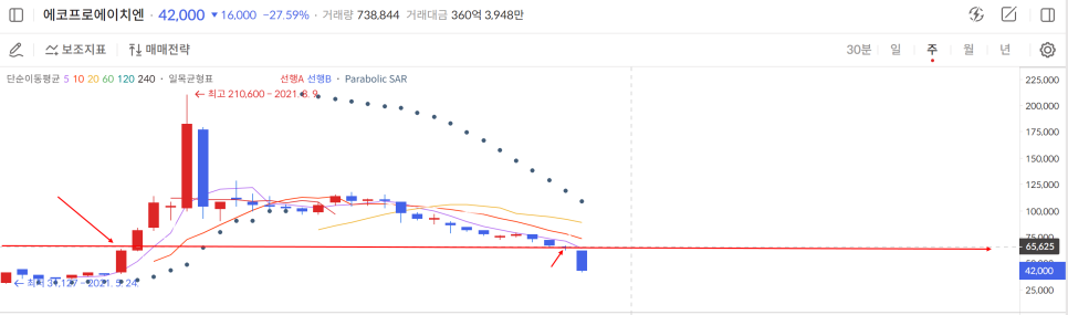 문제는 에코프로,에코프로비엠과는 달리 에코프로에이치엔은 일찍이 하락이 진행되었고