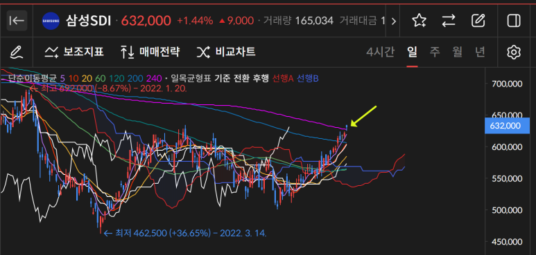 최근 꾸준한 상승을 보여주고 있는 삼성sdi가 240일선을 터치하면서