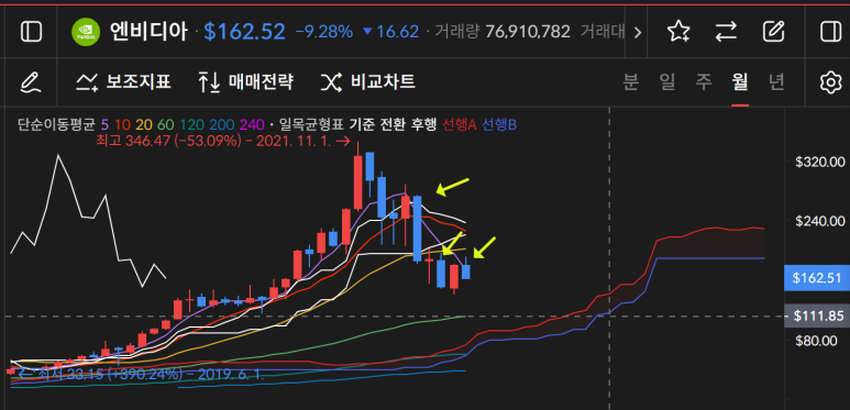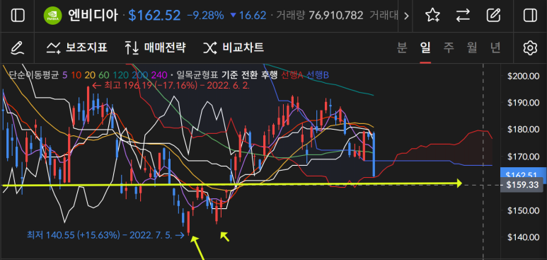 엔비디아 역시 160달러부근의 지지선을 확인해야 하지만 깨질 것을 예상해야하며