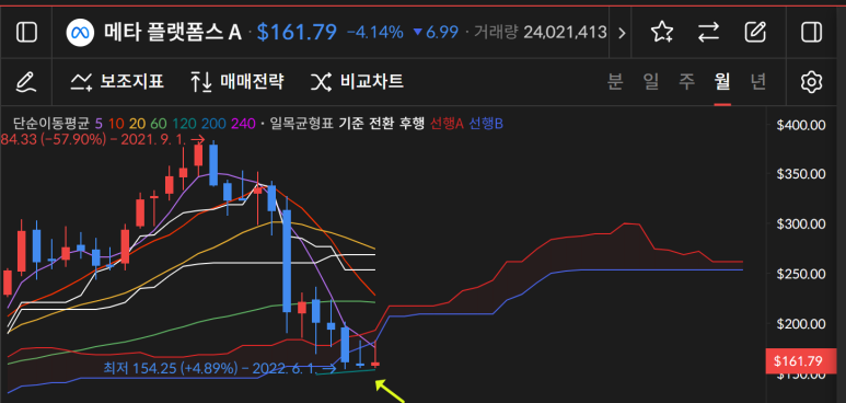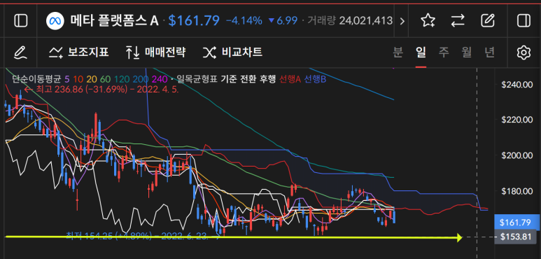 최근의 저점이었던 154달러 이상을 무조건 지켜야 하지만 그것마저도 쉽지 않아보인다.