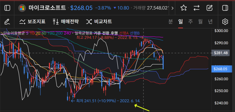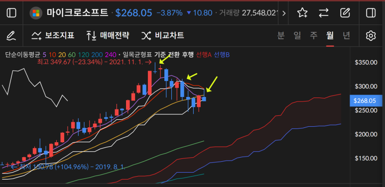 마이크로소프트 역시 월봉으로 조정신호가 나왔으므로,