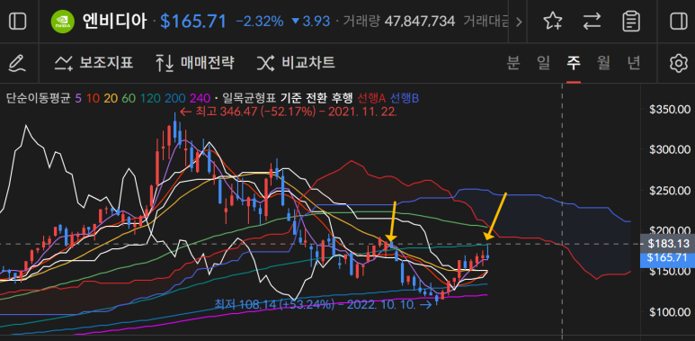 엔비디아 역시 나스닥의 좋지 않은 상황에 비해 좋은 차트가 기록되고 있다.
