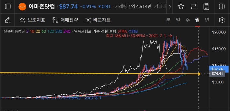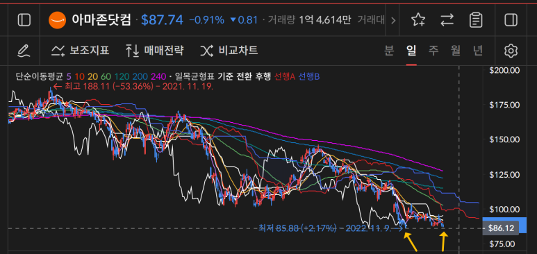 아마존은 일봉상 85달러가 깨지면 차트가 깨지는 것인데 그렇게 될 확률이 높아보인다.