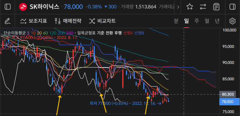 저점갱신 중인 sk하이닉스는 이번에는 77500원을 지키며 쌍바닥을 지지하는지 봐야겠다.