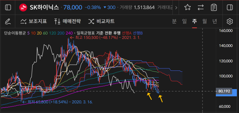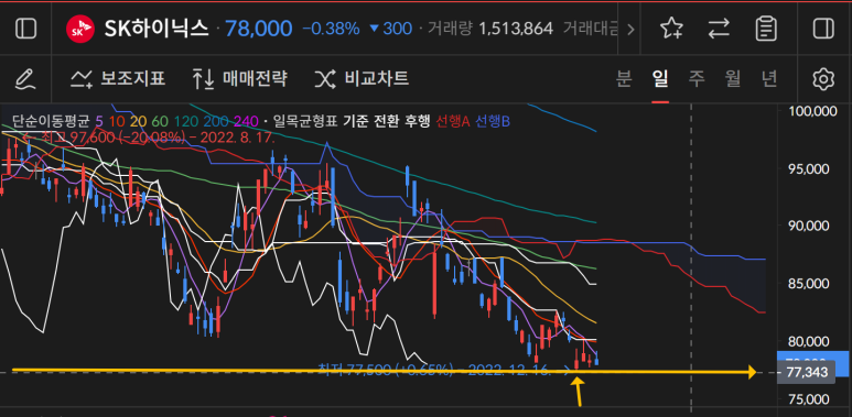 sk하이닉스가 8만원을 계속 지켜오다가 현재 8만이 깨졌는데 일봉상 8만원을 달성하기를 바래야겟다.