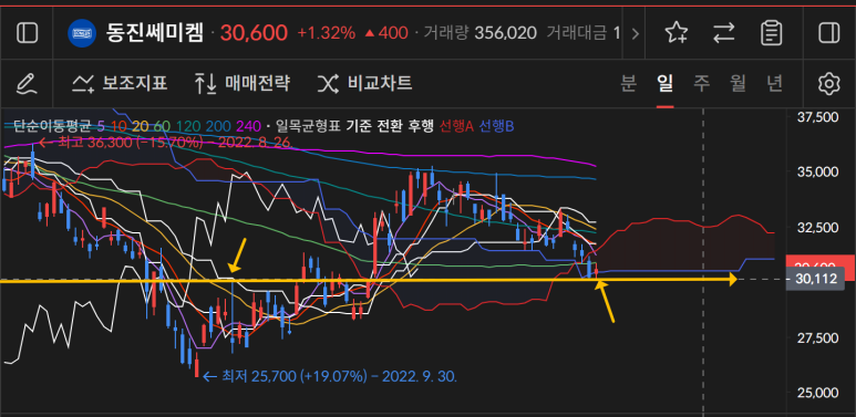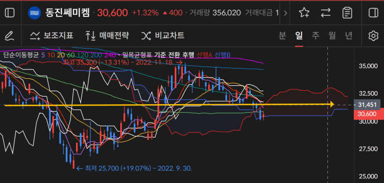 동진쎄미켐은 3만원을 기준으로 반등이 나온 상황이며 지지하는 것으로 보인다.