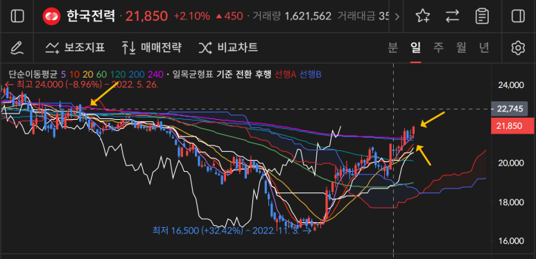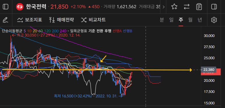 한국전력이 240일선을 뚫었으니 오를 자리를 확인해야 한다.