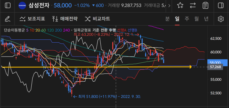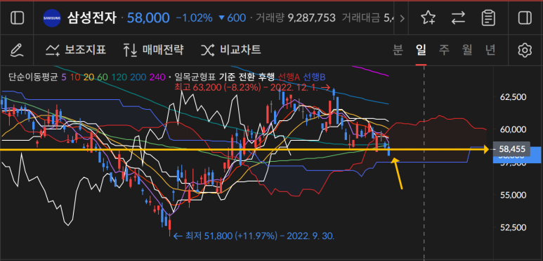 지지선이라 보였던 58400원 부근에서 58000원까지 하락했는데 내일은 소폭반등이 있을 것으로 보인다.