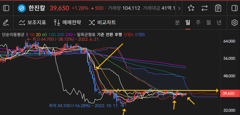 한진칼은 저점을 높여가는 형태로 이 전의 저항을 돌파하려는 중요한 위치까지 왔다.