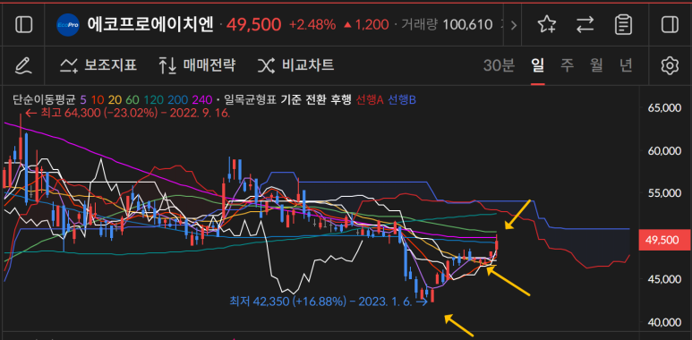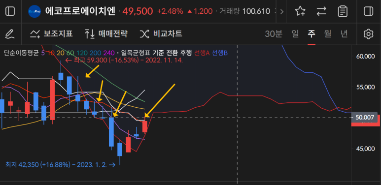 에코프로에이치엔은 주차트로 5만원을 돌파하고 5만원을 지지하는게 목표다.
