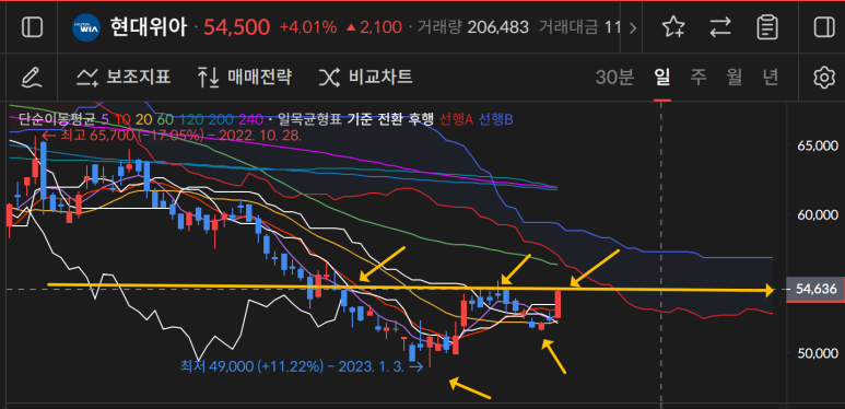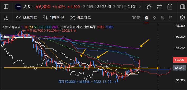 기아는 65000원을 돌파하는 상승이 나왔지만 결국은 지금의 가격대를 지지해야하는 게 목표다.