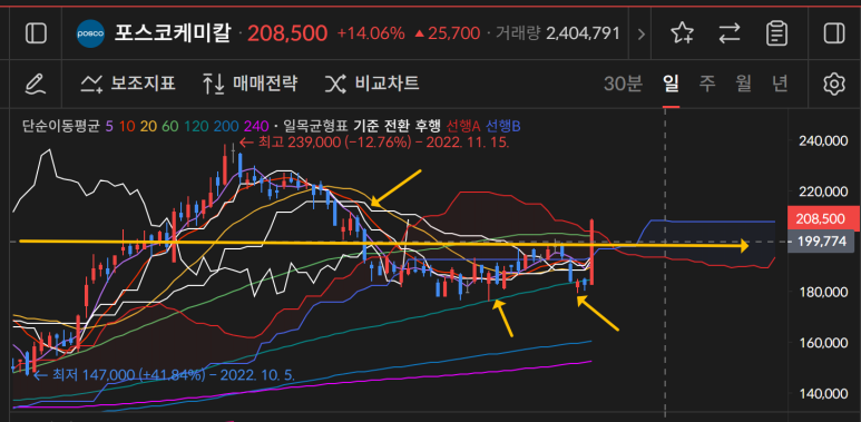 포스코케미칼은 일차트로 120일선을 지지하면서 W를 만들었고 오늘 14%라는 큰 상승이 나오면서 한번에 20만원을 돌파한 것이 포인트다.