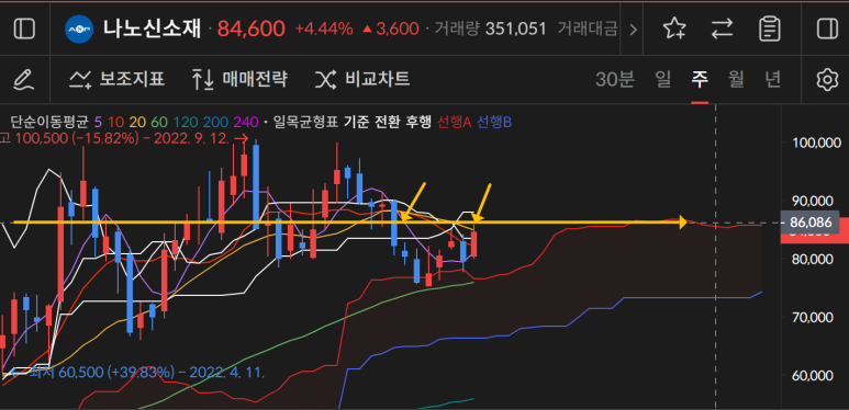 나노신소재가 어제 82000원에서 한 번에 84600원이 되었고