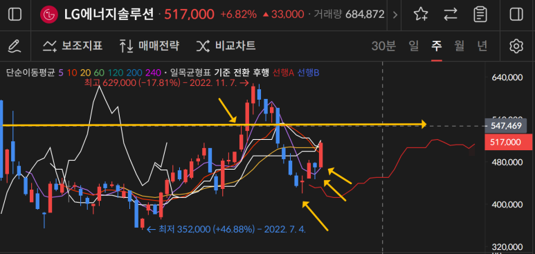 LG엔솔이 한 번에 50만원을 돌파하면서 저점을 높인 W차트를 보여주었고 동시에 60일선을 터치하며 마감했다.