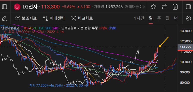 요즘 핫한 lg전자는 114200원이 되었고 이는 지금까지지 나온 상승중에 가장 큰 상승세를 보여주고 있다는 점에서 긍정적으로 볼 수 있겠다.