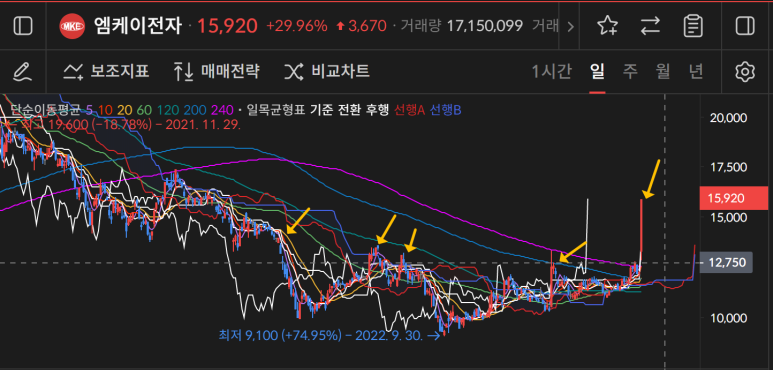 엠케이전자가 13000원을 돌파하며 30%의 상승이 나왔다.