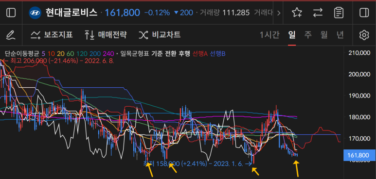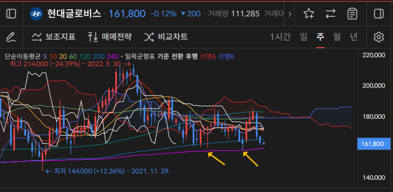 현대글로비스가 240일 부근에서 큰 하락을 보였고