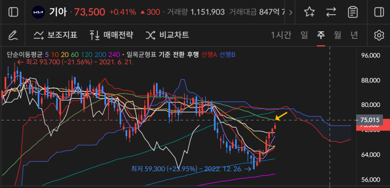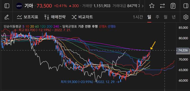 기아가 74000원을 만들며 240일선을 터치하고 윗꼬리를 남기며 73500원으로 마감이 되었는데