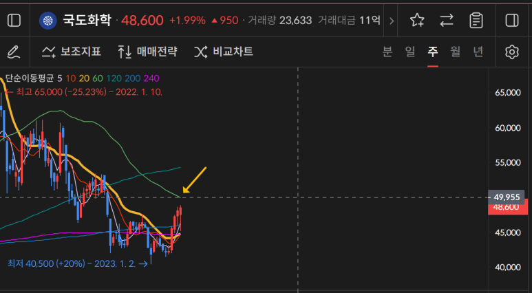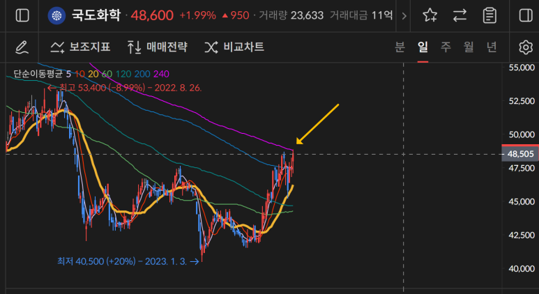 국도화학이 48500원을 돌파 한 뒤 240일선까지 닿는 상승이 나온 게 의미 있는 마감이었다.