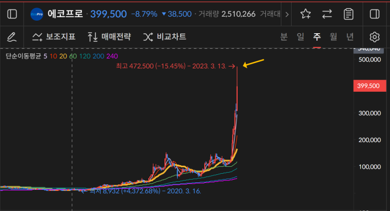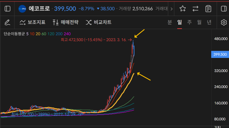 한 눈에 봐도 급상승한 에코프로는 최근 472500원 이후 이틀 연속 음봉을 기록했다.