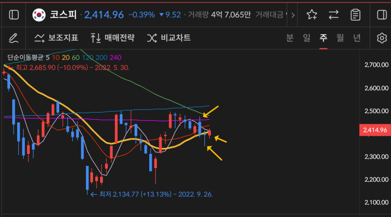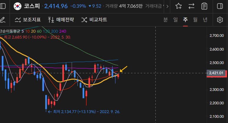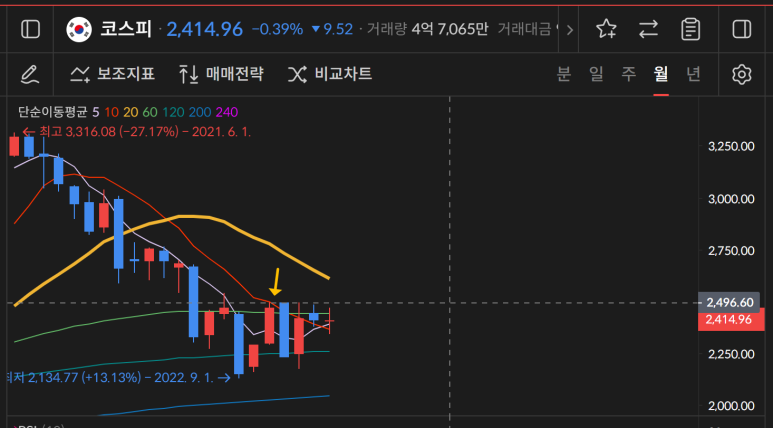 코스피가 매월 2500을 기준으로 저항이 나왔는데