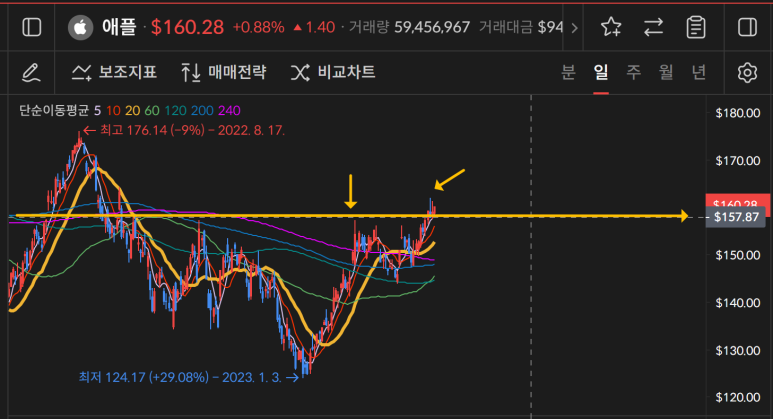 지금부터는 160달러 돌파와함께 이 전 고점인 162달러 돌파다.
