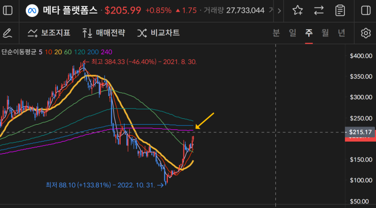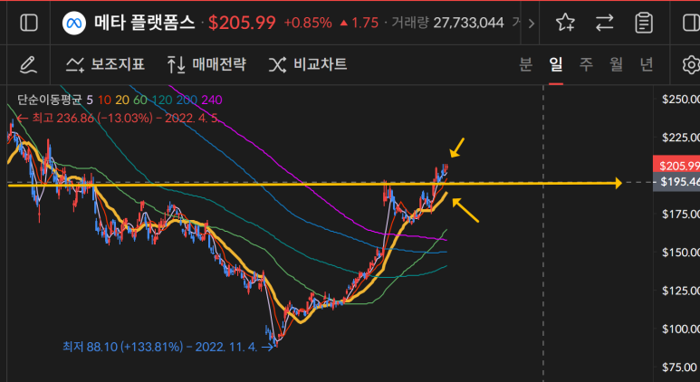 메타가 현재 상승세이기 때문에 지금보다 더 상승할 수 있을 것으로 보인다.