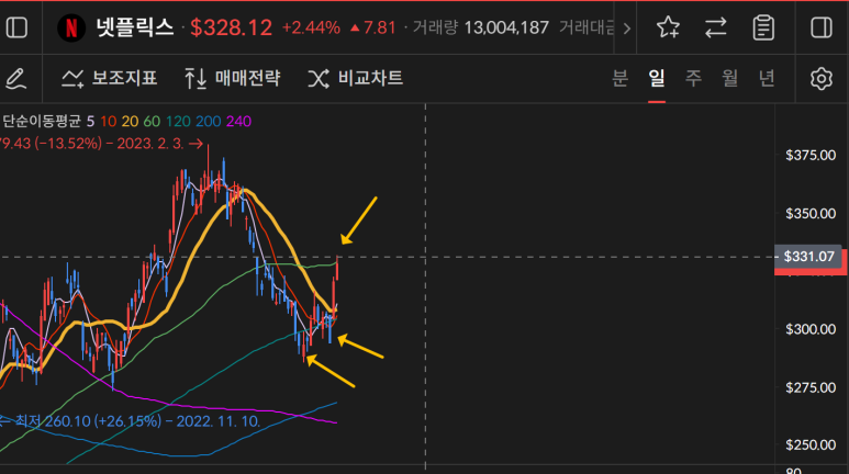 넷플릭스는 일차트상 120일선을 지지하면서 상승이 나왔다.