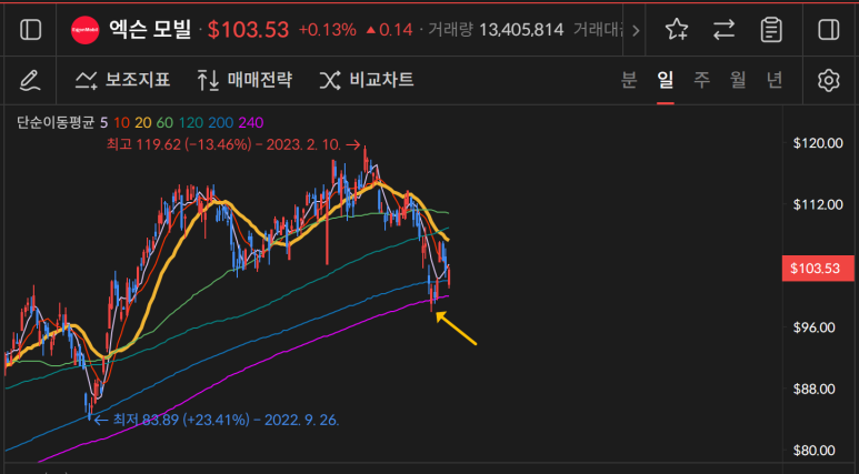 엑슨모빌은 240일선을 지켰고 200일선을 지킨 상황에서 마감이 되었다.