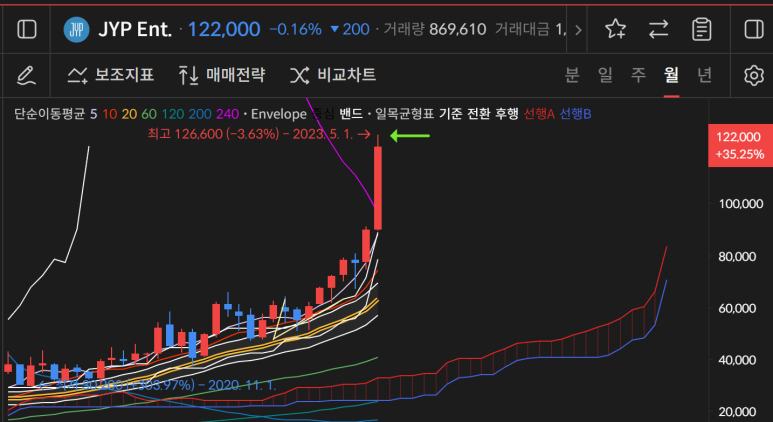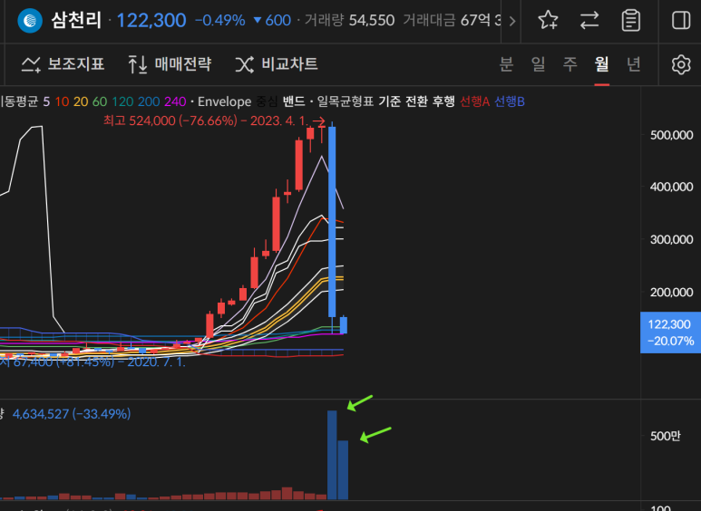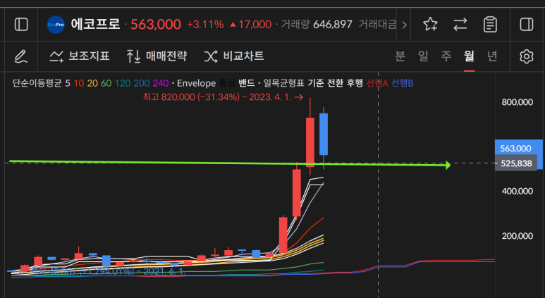 에코프로가 오늘 3%의 상승이 나왔지만 그럼에도 월차트의 5월은 음봉으로 마감되었다.