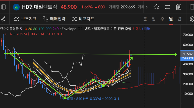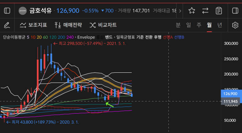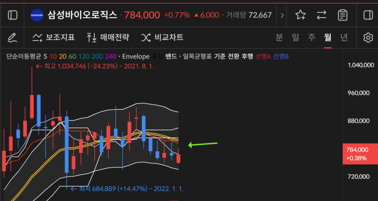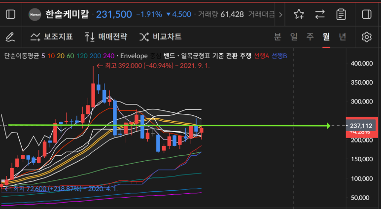 240일선을 간신히 회복했으나 다시 240일선이 깨지면서 50만원이 깨질 위기에 처해있다.