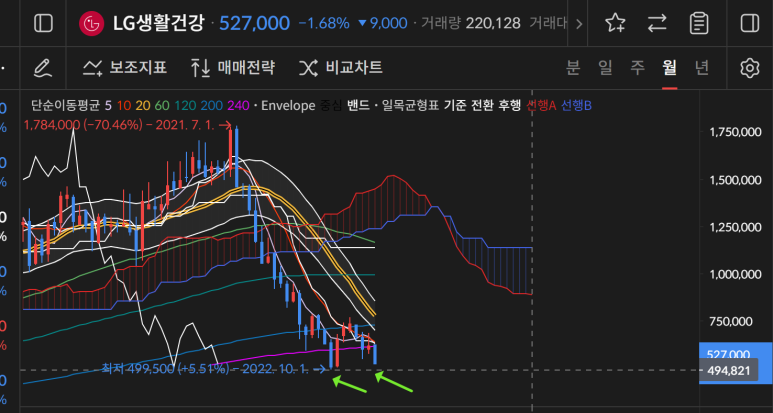 lg샐활건강은 이 전 저점 22년10월에 기록한 499500원을 지켜야하는 상황인데