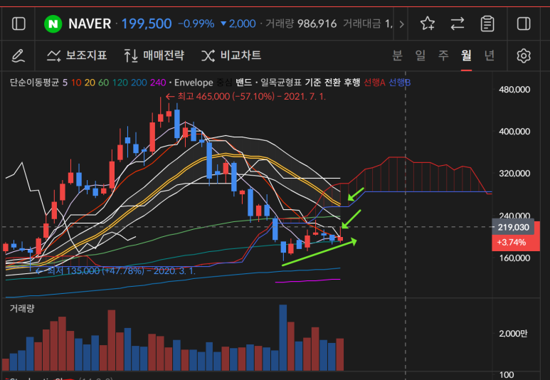 네이버는 거래량이 회복되고 있으며 큰 상승은 없었지만
