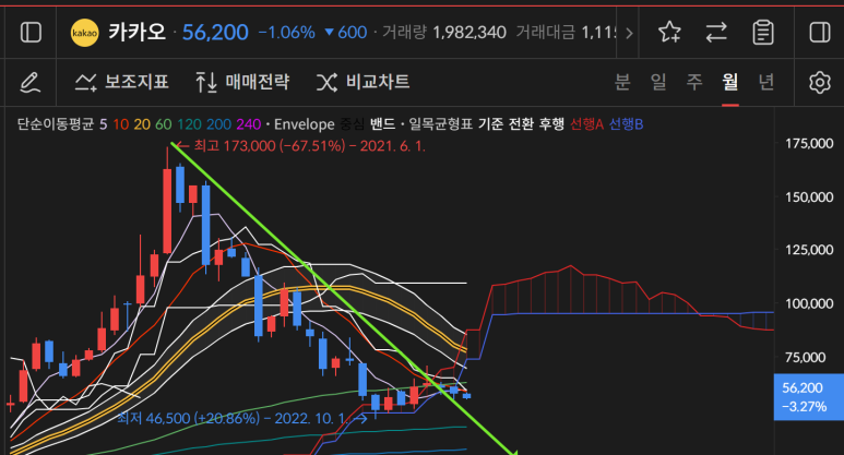5만원대 완전한 후반도 아닌 56200원이라는 5만원 중반대에 가까운 주가인 카카오는 현재 상황상 60일선을 회복하는게 급선무일 듯 하다.