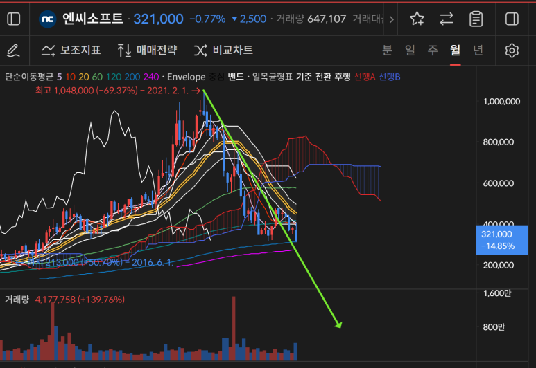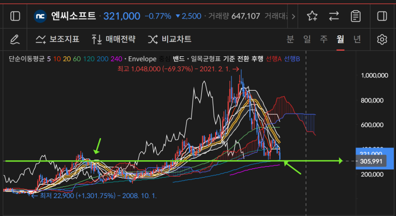 엔씨소프트는 상당히 위험한 자리에 있으며 현재 위치상 한번쯤 반등이 나와야 하는 상황이다.