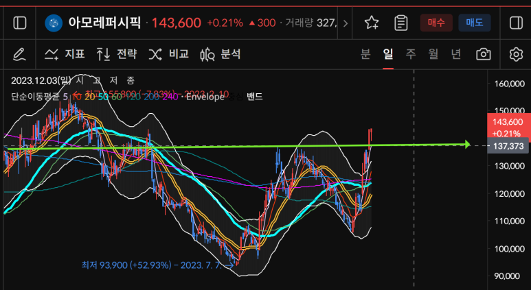 아모레퍼시픽이 137000원을 돌파한 이후 오늘은 밑꼬리양봉을 기록하면서 143600원이 되었다.