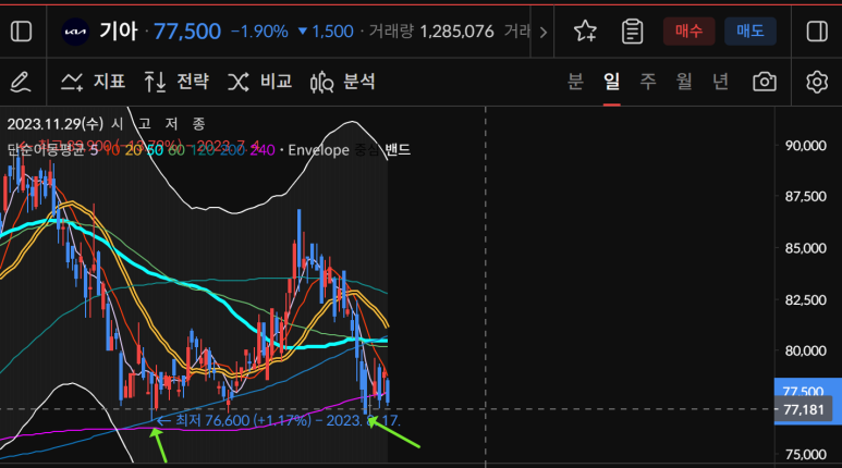 기아는 이 전 저점 76600원 위인 77500원을 기록하고 있다.