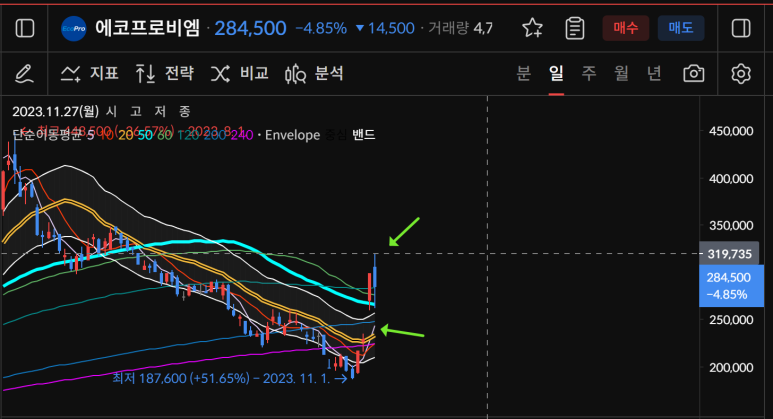에코프로비엠은 당분간 조심할 필요가 있는 종목이 되었다. 긴 음봉이 기록되면서 갭상승을 해던 구간까지 밀릴 수 잇기 때문에 조심해야한다.