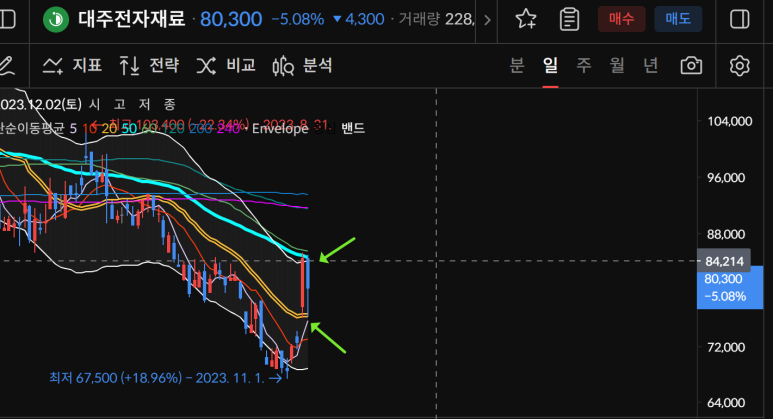 대주전자재료는 어제 큰 상승이 나왔고 오늘 큰 하락을 했다.