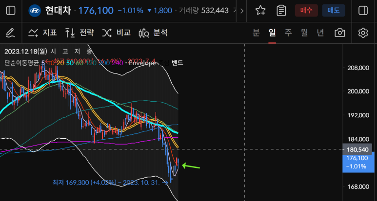 현대차는 오늘 밑꼬리음봉으로 176100원을 기록했다.