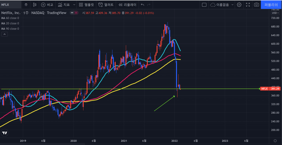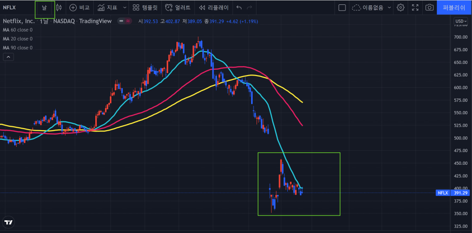 넷플릭스 역시 이평선을 이탈하며 차트가 깨졌지만