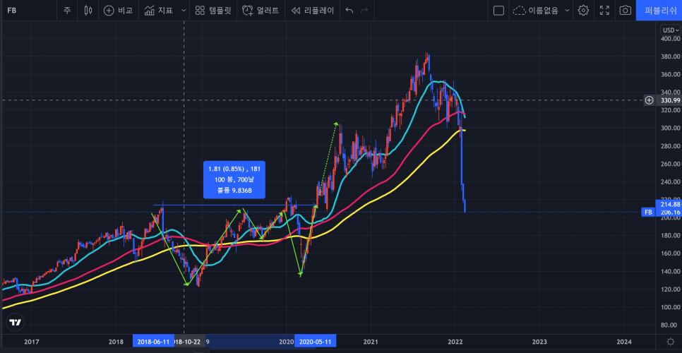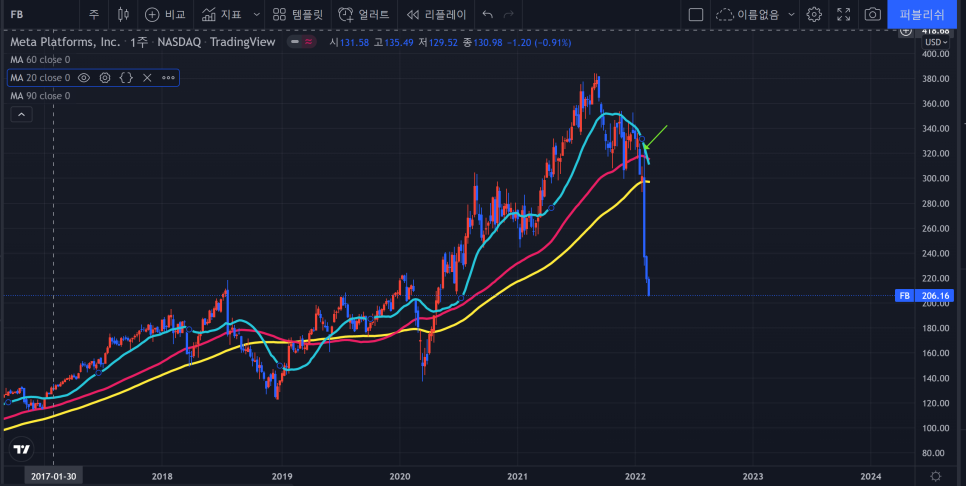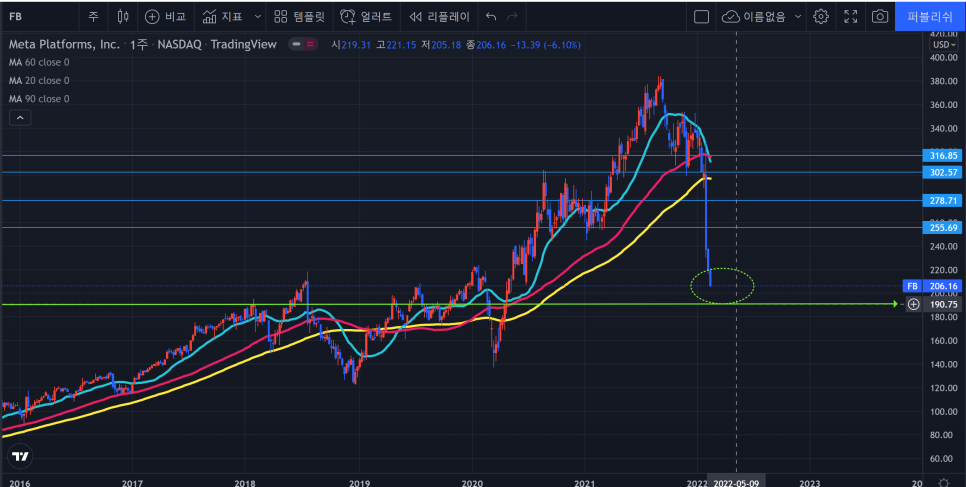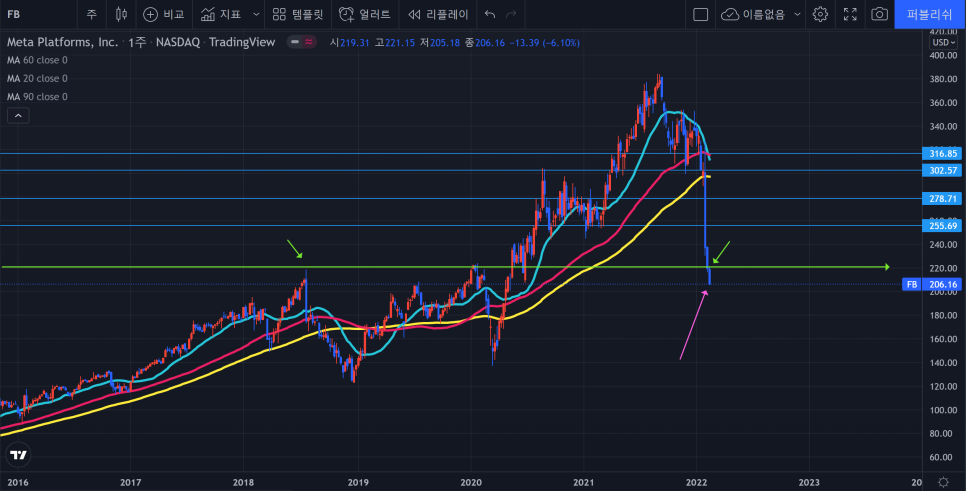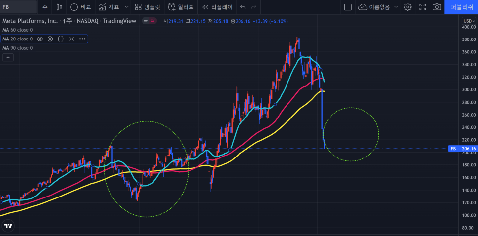 메타의 지난주 자리처럼 저항과 지지를 동시에 확인 할 수 있는 위치로 끝났다는 점이다.